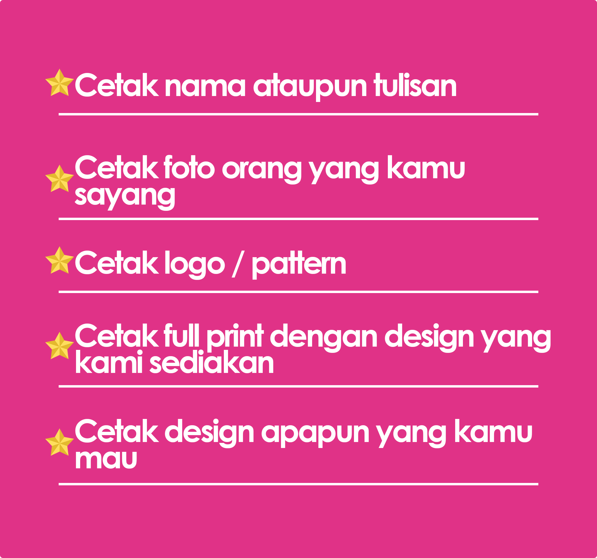 Untuk design – design 1 warna seperti logo, nama, tulisan, siluet, kamu bisa pilih metode cetak GRAFIR